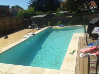 A nice little oasis in Five Dock here, the interior is pure white giving an inviting blue water with our Travatine paver makes this the perfect family backyard.